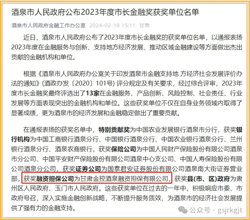 近日,酒泉市人民政府公布了2023年度市长金融奖的获奖单位名单,通报表扬2023年度在金融服务与创新、支持地方经济发展、推动区域金融建设等方面做出杰出贡献的金融机构和单位,甘肃开云足球酒泉融资担保有限公司荣获酒泉市“2023年度市长金融奖”。